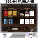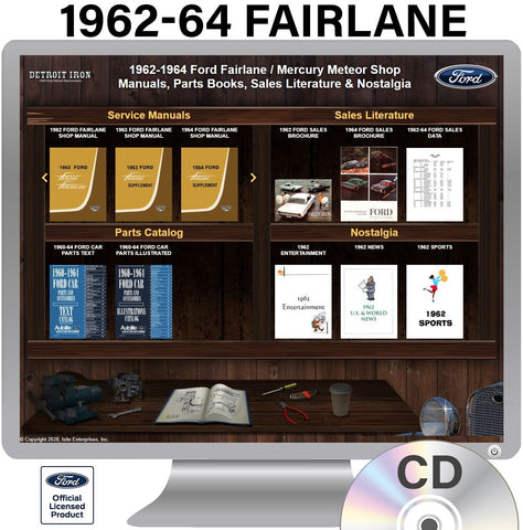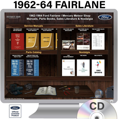The 1962-1964 Fairlane Shop Manuals, Sales Literature & Parts Books on USB is a digital product published by Detroit Iron and licensed by Ford. This Detroit Iron digital product provides a full set of original equipment manufacturer (OEM) repair and rebuild literature in digital / PDF format. This set of manuals and literature were originally authored and published by the car / truck manufacturer to be used by their dealership mechanics so they are very comprehensive. It features an easy-to-use bookcase in a garage scene containing a set of PDF manuals, catalogs, brochures and nostalgia for a specific year, make and model range.