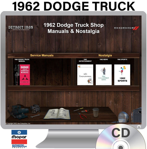 The 1962 Dodge Truck Shop Manual on CD is a digital product published by Detroit Iron and licensed by Chrysler. This Detroit Iron digital product provides a full set of original equipment manufacturer (OEM) repair and rebuild literature in digital / PDF format. This set of manuals and literature were originally authored and published by the car / truck manufacturer to be used by their dealership mechanics so they are very comprehensive. It features an easy-to-use bookcase in a garage scene containing a set of PDF manuals, catalogs, brochures and nostalgia for a specific year, make and model range.