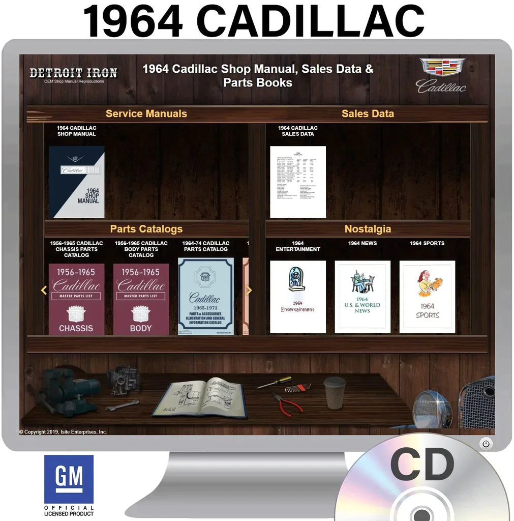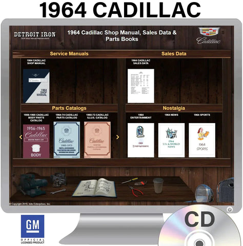 The 1964 Cadillac Shop Manual, Sales Data & Parts Books on CD is a digital product published by Detroit Iron and licensed by GM. This Detroit Iron digital product provides a full set of original equipment manufacturer (OEM) repair and rebuild literature in digital / PDF format. This set of manuals and literature were originally authored and published by the car / truck manufacturer to be used by their dealership mechanics so they are very comprehensive. It features an easy-to-use bookcase in a garage scene containing a seto of PDF manuals, catalogs, brochures and nostalgia for a specific year, make and model range.