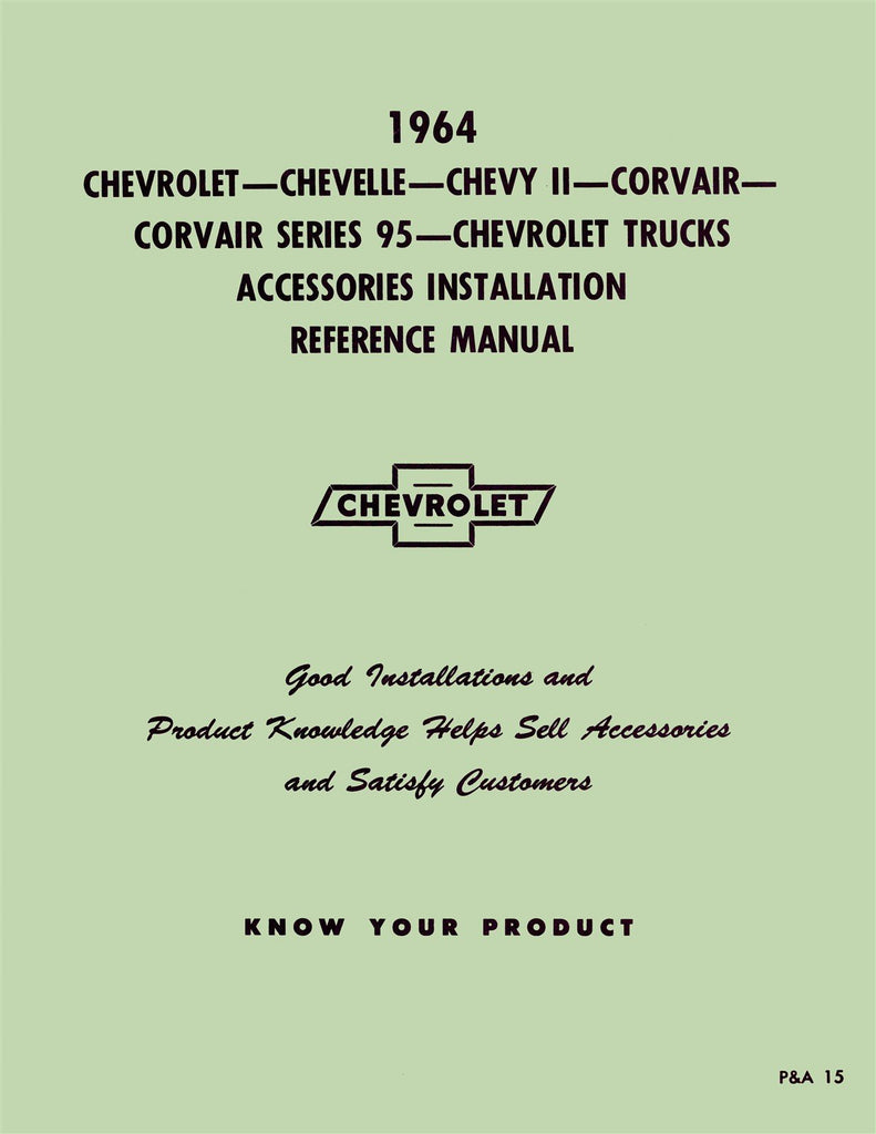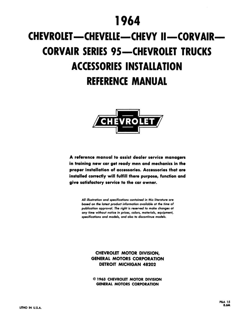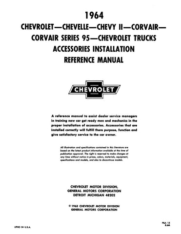 With the 1964 Chevrolet Car and Truck Accessories Installation Reference Manual in your toolbox, you have the most comprehensive literature at your fingertips to take on the most challenging repair, service and restoration projects. This factory-written Detroit Iron shop manual is perfect for the restorer or anyone working on one of these vehicles.
