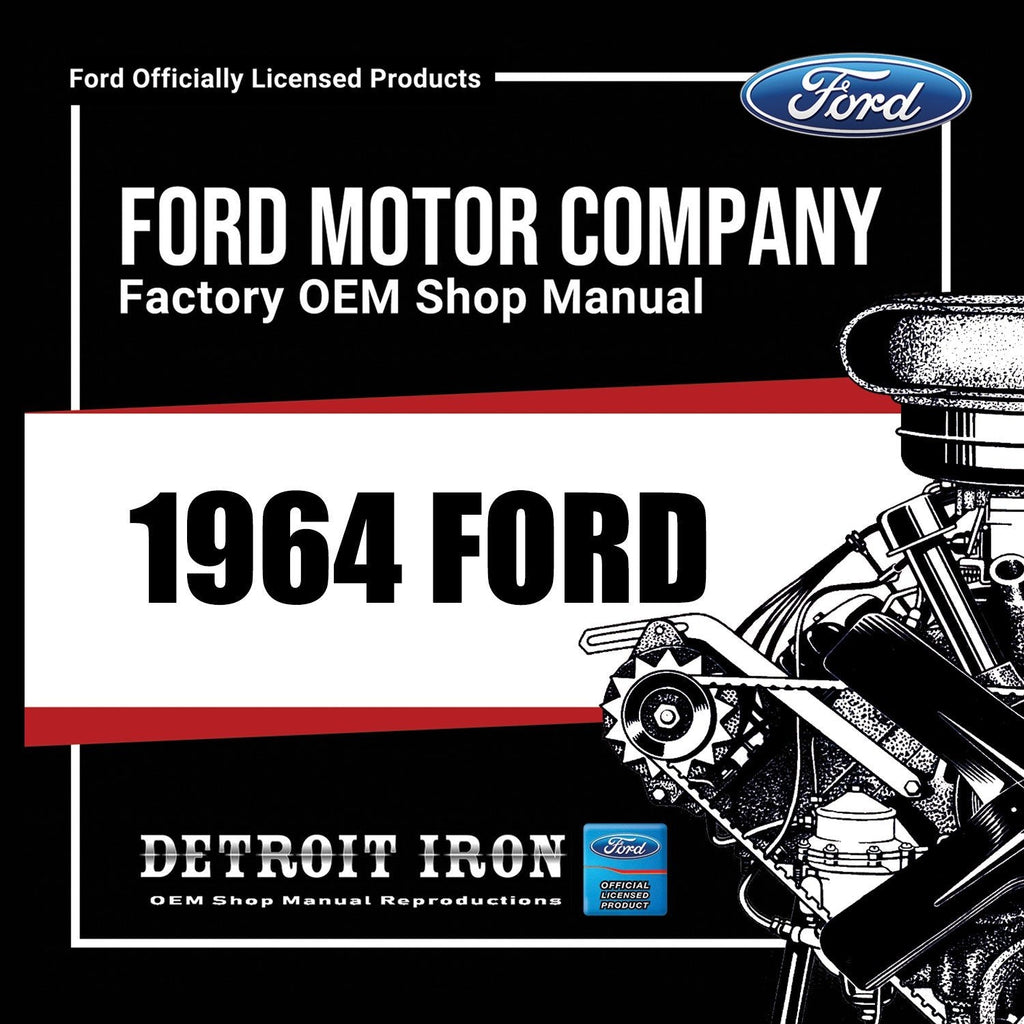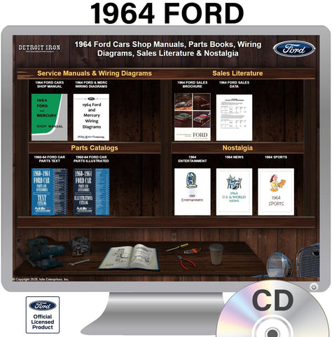 The 1964 Ford Shop Manuals, Wiring Diagrams, Sales Literature & Parts Books on USB is a digital product published by Detroit Iron and licensed by Ford. This Detroit Iron digital product provides a full set of original equipment manufacturer (OEM) repair and rebuild literature in digital / PDF format. This set of manuals and literature were originally authored and published by the car / truck manufacturer to be used by their dealership mechanics so they are very comprehensive. It features an easy-to-use bookcase in a garage scene containing a set of PDF manuals, catalogs, brochures and nostalgia for a specific year, make and model range.