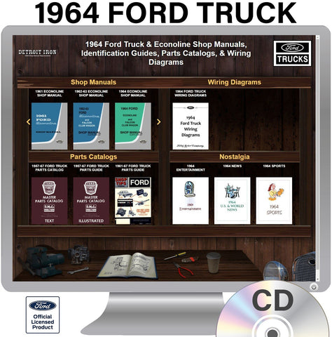 The 1964 Ford Truck / Van Shop Manuals, Wiring Diagrams & Parts Books on CD is a digital product published by Detroit Iron and licensed by Ford. This Detroit Iron digital product provides a full set of original equipment manufacturer (OEM) repair and rebuild literature in digital / PDF format. This set of manuals and literature were originally authored and published by the car / truck manufacturer to be used by their dealership mechanics so they are very comprehensive. It features an easy-to-use bookcase in a garage scene containing a set of PDF manuals, catalogs, brochures and nostalgia for a specific year, make and model range.