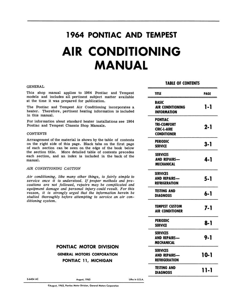 With the 1964 Pontiac Air Conditioning Shop Manual in your toolbox, you have the most comprehensive literature at your fingertips to take on the most challenging repair, service and restoration projects. This factory written Detroit Iron shop manual is perfect for the restorer or anyone working on one of these vehicles.