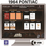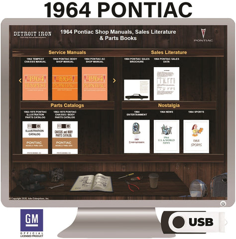 The 1964 Pontiac Shop Manuals, Sales Literature & Parts Books on USB is a digital product published by Detroit Iron and licensed by GM. This Detroit Iron digital product provides a full set of original equipment manufacturer (OEM) repair and rebuild literature in digital / PDF format. This set of manuals and literature were originally authored and published by the car / truck manufacturer to be used by their dealership mechanics so they are very comprehensive. It features an easy-to-use bookcase in a garage scene containing a set of PDF manuals, catalogs, brochures and nostalgia for a specific year, make and model range.