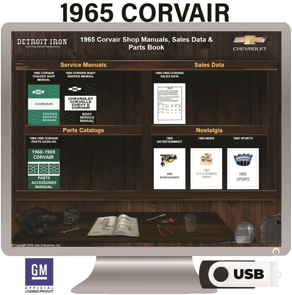 The 1965 Corvair Shop Manuals, Body Manual, Sales Data & Parts Book on USB is a digital product published by Detroit Iron and licensed by GM. This Detroit Iron digital product provides a full set of original equipment manufacturer (OEM) repair and rebuild literature in digital / PDF format. This set of manuals and literature were originally authored and published by the car / truck manufacturer to be used by their dealership mechanics so they are very comprehensive. It features an easy-to-use bookcase in a garage scene containing a set of PDF manuals, catalogs, brochures and nostalgia for a specific year, make and model range.