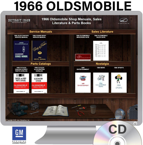 The 1966 Oldsmobile Shop Manuals, Sales Literature & Parts Books on CD is a digital product published by Detroit Iron and licensed by GM. This Detroit Iron digital product provides a full set of original equipment manufacturer (OEM) repair and rebuild literature in digital / PDF format. This set of manuals and literature were originally authored and published by the car / truck manufacturer to be used by their dealership mechanics so they are very comprehensive. It features an easy-to-use bookcase in a garage scene containing a seto of PDF manuals, catalogs, brochures and nostalgia for a specific year, make and model range.