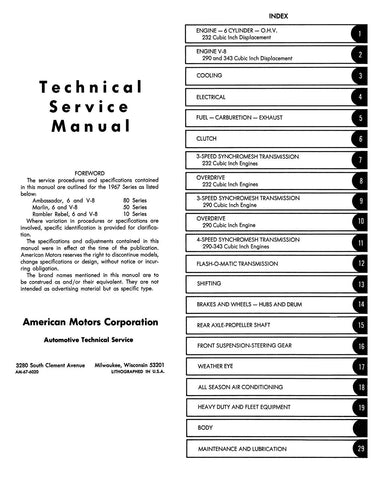 With the 1967 AMC Rebel, Ambassador, Marlin Technical Service Manual in your toolbox, you have the most comprehensive literature at your fingertips to take on the most challenging repair, service and restoration projects. This factory-written Detroit Iron shop manual is perfect for the restorer or anyone working on one of these vehicles.