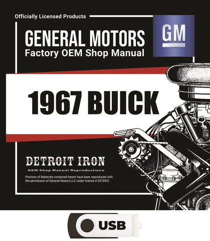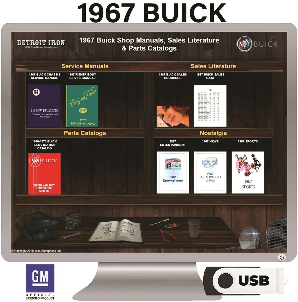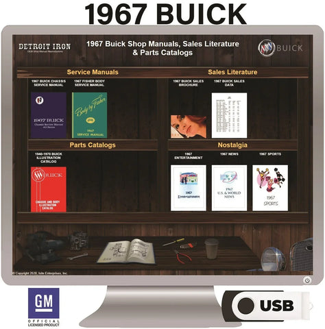 The 1967 Buick Shop Manuals, Sales Literature & Parts Book on USB is a digital product published by Detroit Iron and licensed by GM. This Detroit Iron digital product provides a full set of original equipment manufacturer (OEM) repair and rebuild literature in digital / PDF format. This set of manuals and literature were originally authored and published by the car / truck manufacturer to be used by their dealership mechanics so they are very comprehensive. It features an easy-to-use bookcase in a garage scene containing a set of PDF manuals, catalogs, brochures and nostalgia for a specific year, make and model range.