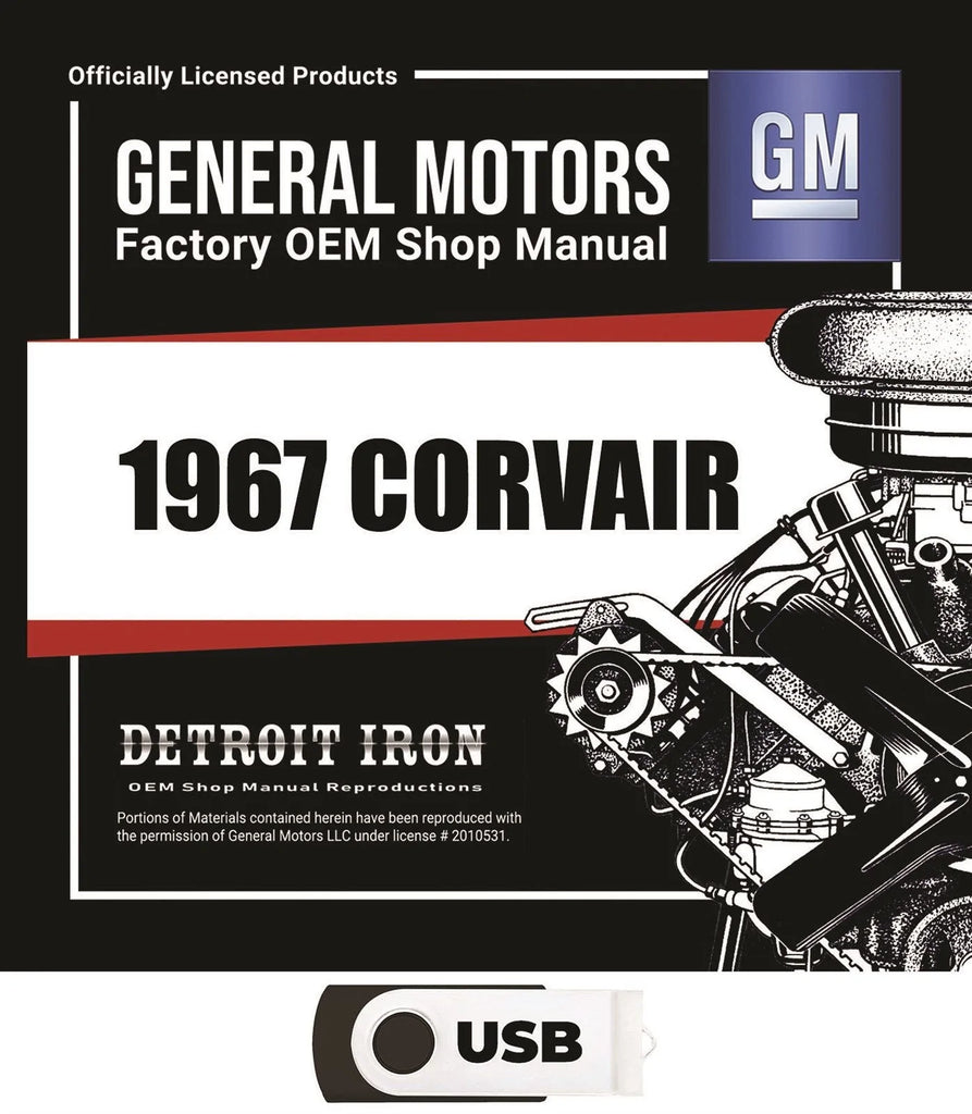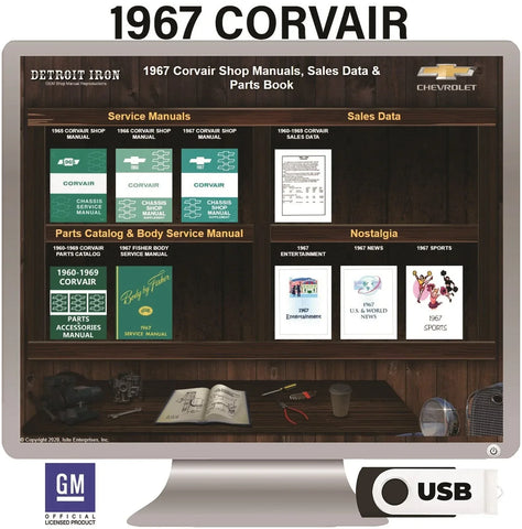 The 1967 Corvair Shop Manuals, Body Manual, Sales Data & Parts Book on USB is a digital product published by Detroit Iron and licensed by GM. This Detroit Iron digital product provides a full set of original equipment manufacturer (OEM) repair and rebuild literature in digital / PDF format. This set of manuals and literature were originally authored and published by the car / truck manufacturer to be used by their dealership mechanics so they are very comprehensive. It features an easy-to-use bookcase in a garage scene containing a set of PDF manuals, catalogs, brochures and nostalgia for a specific year, make and model range.