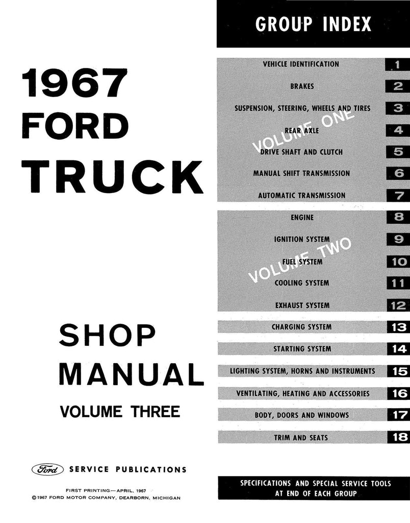 With the 1967 Ford Truck Shop Manual (3 Vol) in your toolbox, you have the most comprehensive literature at your fingertips to take on the most challenging repair, service and restoration projects. This factory-written Detroit Iron shop manual is perfect for the restorer or anyone working on one of these vehicles.