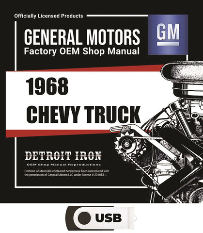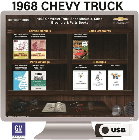 The 1968 Chevrolet Truck Shop Manuals, Sales Brochure & Parts Books on USB is a digital product published by Detroit Iron and licensed by GM. This Detroit Iron digital product provides a full set of original equipment manufacturer (OEM) repair and rebuild literature in digital / PDF format. This set of manuals and literature were originally authored and published by the car / truck manufacturer to be used by their dealership mechanics so they are very comprehensive. It features an easy-to-use bookcase in a garage scene containing a set of PDF manuals, catalogs, brochures and nostalgia for a specific year, make and model range.
