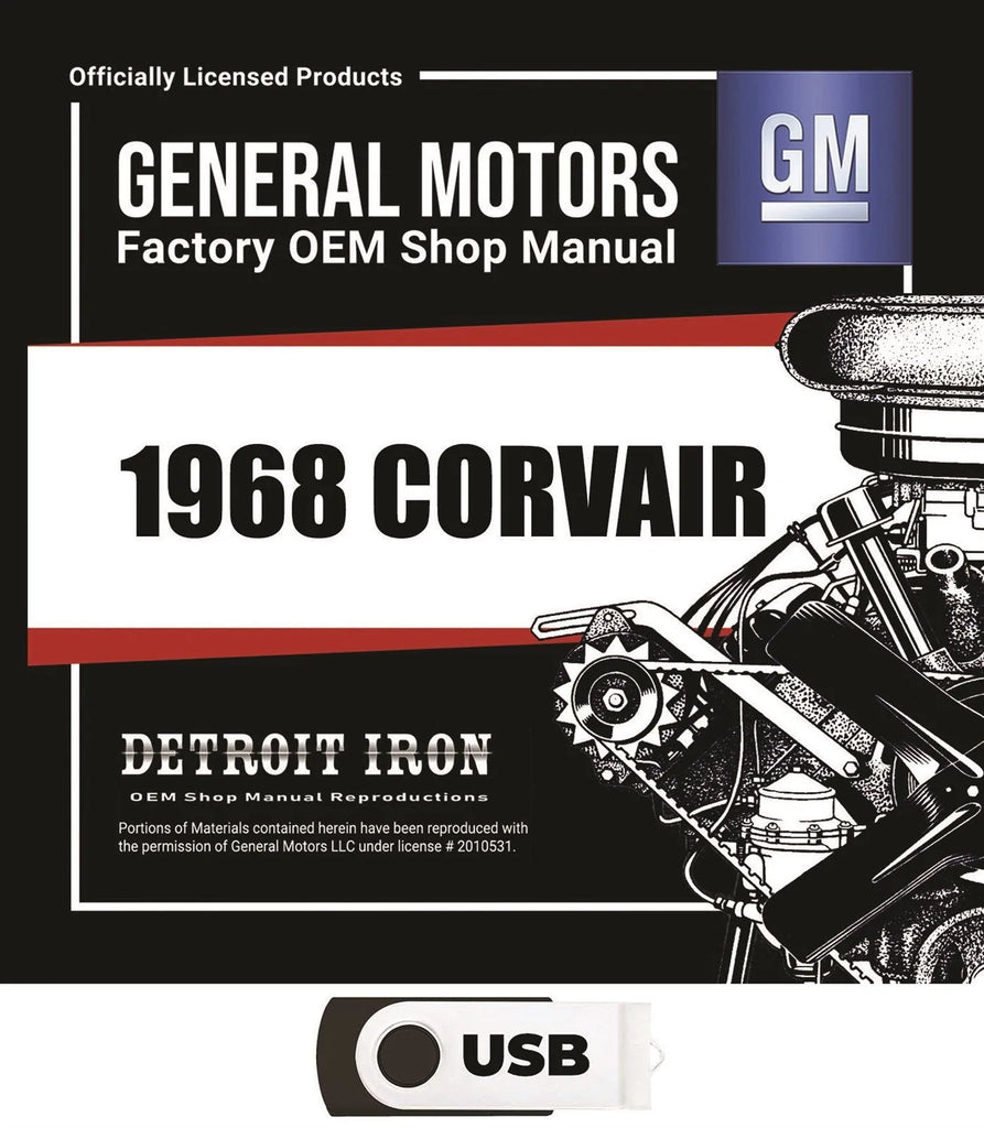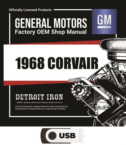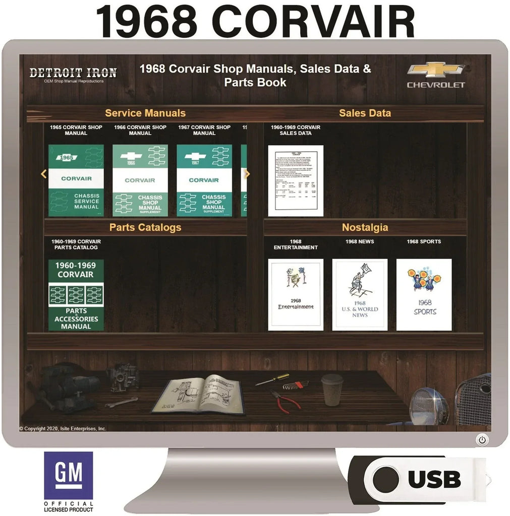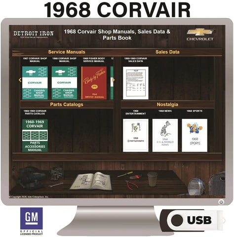 The 1968 Corvair Shop Manuals, Body Manual, Sales Data & Parts Book on USB is a digital product published by Detroit Iron and licensed by GM. This Detroit Iron digital product provides a full set of original equipment manufacturer (OEM) repair and rebuild literature in digital / PDF format. This set of manuals and literature were originally authored and published by the car / truck manufacturer to be used by their dealership mechanics so they are very comprehensive. It features an easy-to-use bookcase in a garage scene containing a set of PDF manuals, catalogs, brochures and nostalgia for a specific year, make and model range.