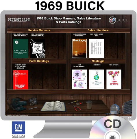 The 1969 Buick Shop Manuals, Sales Literature & Parts Book on CD is a digital product published by Detroit Iron and licensed by GM. This Detroit Iron digital product provides a full set of original equipment manufacturer (OEM) repair and rebuild literature in digital / PDF format. This set of manuals and literature were originally authored and published by the car / truck manufacturer to be used by their dealership mechanics so they are very comprehensive. It features an easy-to-use bookcase in a garage scene containing a seto of PDF manuals, catalogs, brochures and nostalgia for a specific year, make and model range.