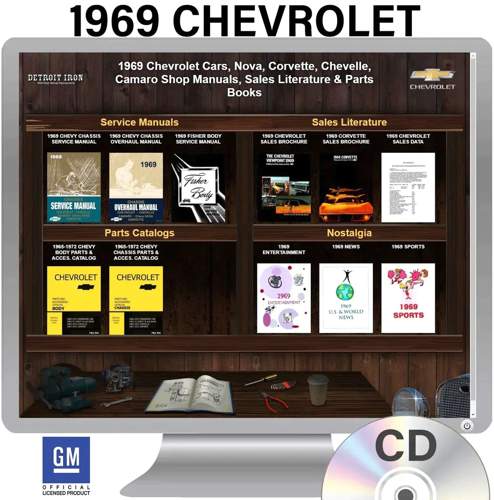 The 1969 Chevrolet Shop Manuals, Sales Literature & Parts Books on CD is a digital product published by Detroit Iron and licensed by GM. This Detroit Iron digital product provides a full set of original equipment manufacturer (OEM) repair and rebuild literature in digital / PDF format. This set of manuals and literature were originally authored and published by the car / truck manufacturer to be used by their dealership mechanics so they are very comprehensive. It features an easy-to-use bookcase in a garage scene containing a seto of PDF manuals, catalogs, brochures and nostalgia for a specific year, make and model range.