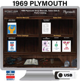 The 1969 Plymouth Shop Manual, Sales Data & Parts Book on USB is a digital product published by Detroit Iron and licensed by Chrysler. This Detroit Iron digital product provides a full set of original equipment manufacturer (OEM) repair and rebuild literature in digital / PDF format. This set of manuals and literature were originally authored and published by the car / truck manufacturer to be used by their dealership mechanics so they are very comprehensive. It features an easy-to-use bookcase in a garage scene containing a set of PDF manuals, catalogs, brochures and nostalgia for a specific year, make and model range.