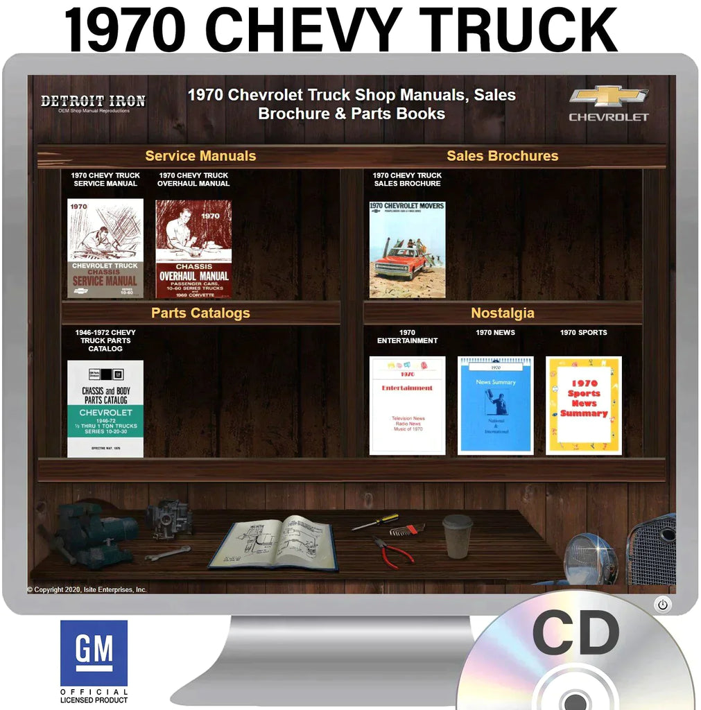 The 1970 Chevrolet Truck Shop Manuals, Sales Brochure & Parts Book on CD is a digital product published by Detroit Iron and licensed by GM. This Detroit Iron digital product provides a full set of original equipment manufacturer (OEM) repair and rebuild literature in digital / PDF format. This set of manuals and literature were originally authored and published by the car / truck manufacturer to be used by their dealership mechanics so they are very comprehensive. It features an easy-to-use bookcase in a garage scene containing a seto of PDF manuals, catalogs, brochures and nostalgia for a specific year, make and model range.