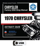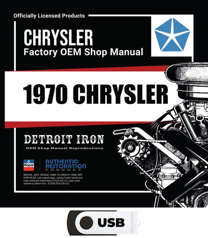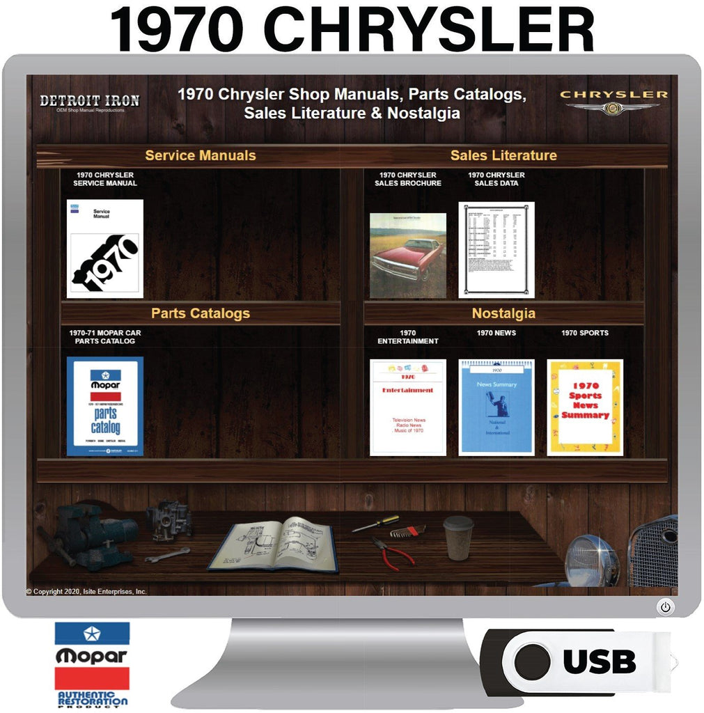 The 1970 Chrysler Shop Manual, Sales Literature, and Parts Book on USB is a digital product published by Detroit Iron and licensed by Chrysler. This Detroit Iron digital product provides a full set of original equipment manufacturer (OEM) repair and rebuild literature in digital / PDF format. This set of manuals and literature were originally authored and published by the car / truck manufacturer to be used by their dealership mechanics so they are very comprehensive. It features an easy-to-use bookcase in a garage scene containing a set of PDF manuals, catalogs, brochures and nostalgia for a specific year, make and model range.