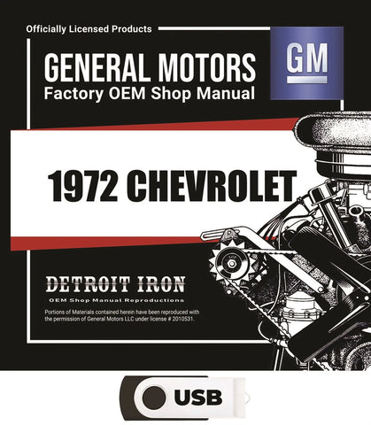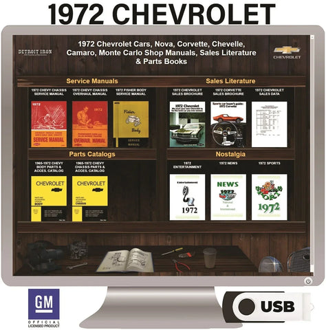 The 1972 Chevrolet Shop Manuals, Sales Literature & Parts Books on USB is a digital product published by Detroit Iron and licensed by GM. This Detroit Iron digital product provides a full set of original equipment manufacturer (OEM) repair and rebuild literature in digital / PDF format. This set of manuals and literature were originally authored and published by the car / truck manufacturer to be used by their dealership mechanics so they are very comprehensive. It features an easy-to-use bookcase in a garage scene containing a set of PDF manuals, catalogs, brochures and nostalgia for a specific year, make and model range.