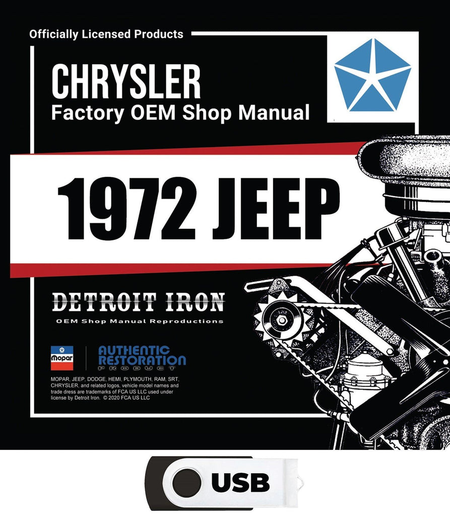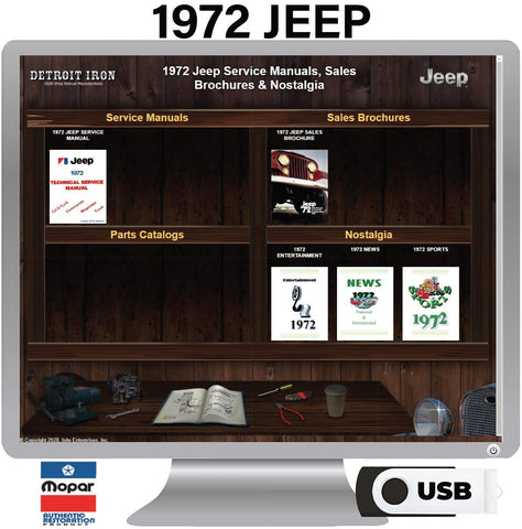 The 1972 Jeep Shop Manual & Sales Brochures on USB is a digital product published by Detroit Iron and licensed by Chrysler. This Detroit Iron digital product provides a full set of original equipment manufacturer (OEM) repair and rebuild literature in digital / PDF format. This set of manuals and literature were originally authored and published by the car / truck manufacturer to be used by their dealership mechanics so they are very comprehensive. It features an easy-to-use bookcase in a garage scene containing a set of PDF manuals, catalogs, brochures and nostalgia for a specific year, make and model range.