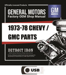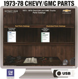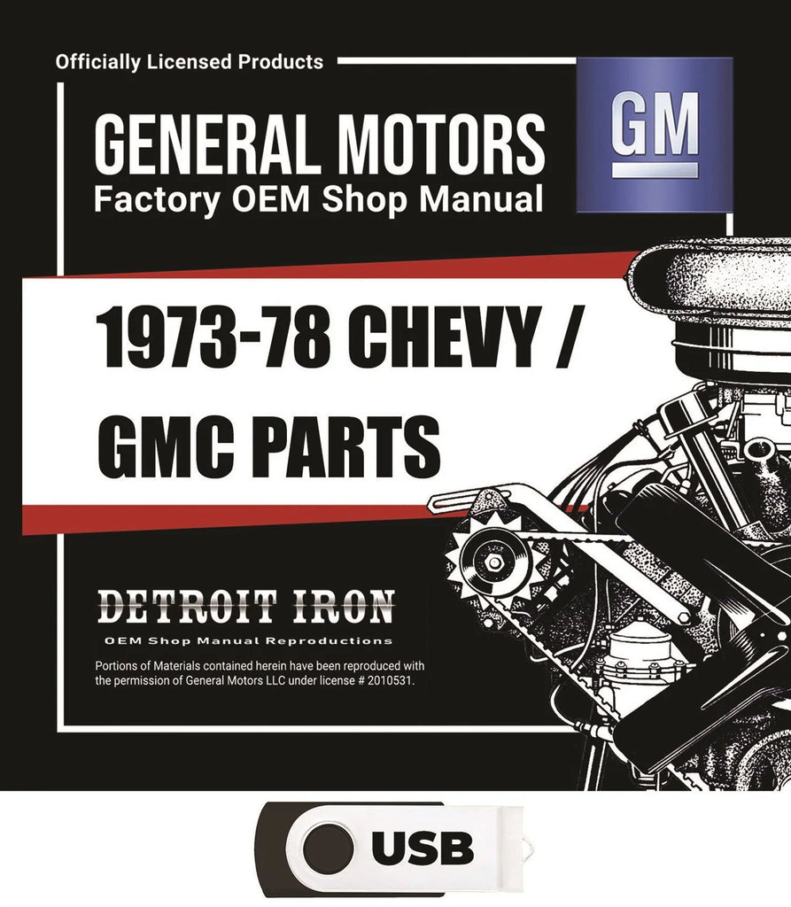 The 1973-1978 Chevrolet Trucks / GMC Trucks Parts Manuals (Only) on USB is a digital product published by Detroit Iron and licensed by GM. This Detroit Iron digital product provides a full set of original equipment manufacturer (OEM) repair and rebuild literature in digital / PDF format. This set of manuals and literature were originally authored and published by the car / truck manufacturer to be used by their dealership mechanics so they are very comprehensive. It features an easy-to-use bookcase in a garage scene containing a set of PDF manuals, catalogs, brochures and nostalgia for a specific year, make and model range.