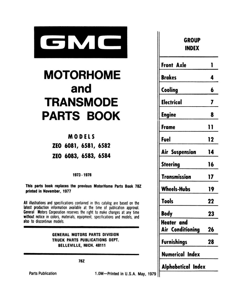 The 1973 - 1978 GMC Motorhome Parts Manual is a high quality reproduction of the exact manual originally published by the Auto manufacturer to be used by their dealer mechanics and parts personal. Each manual contains detailed parts illustrations and part number descriptions for all major subsystem components such as: Front Axle, Brakes, Cooling, Electrical, Engine, Frame, Fuel, Air Suspension, Steering, Transmission, Wheels-Hubs, Tools, Body, Heat / Air Conditioning, and Furnishings.