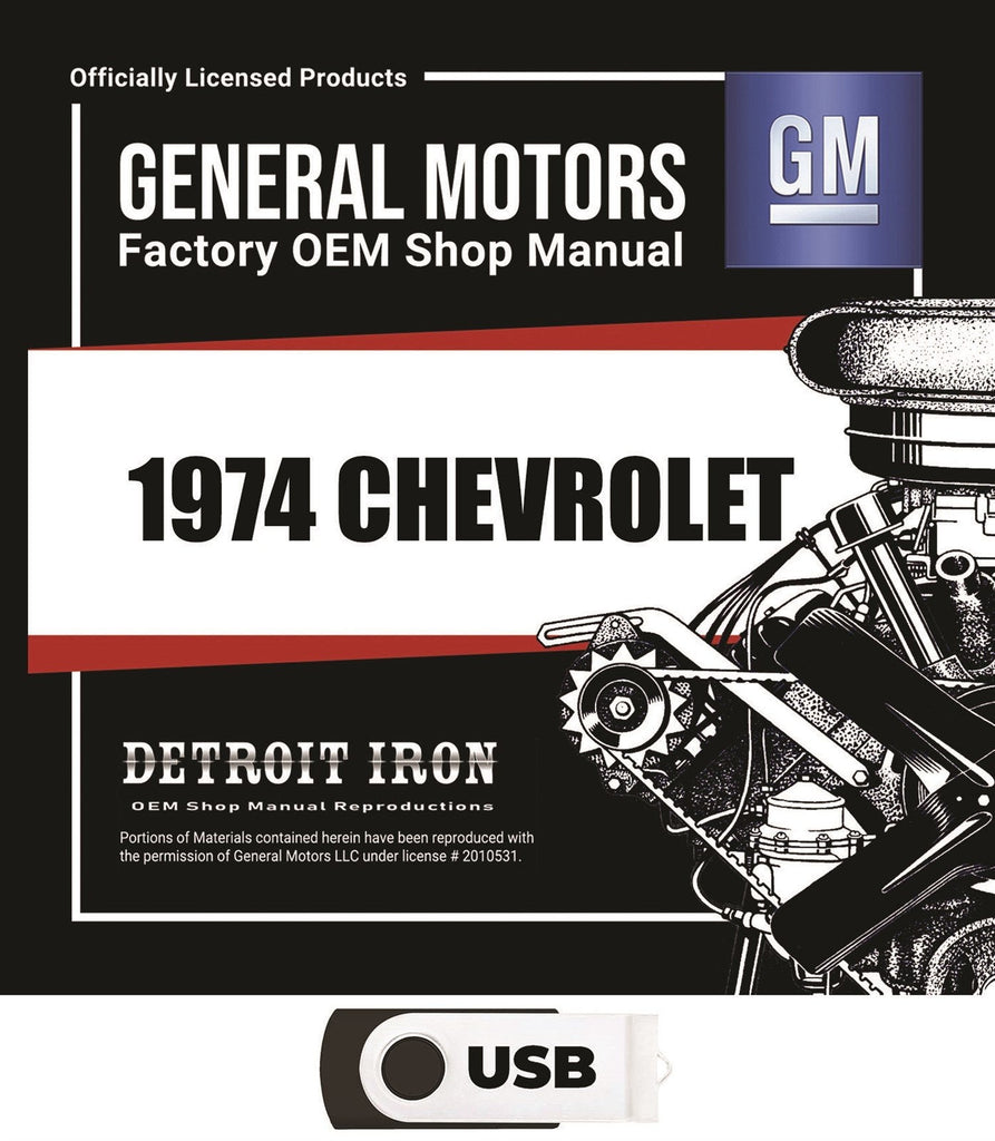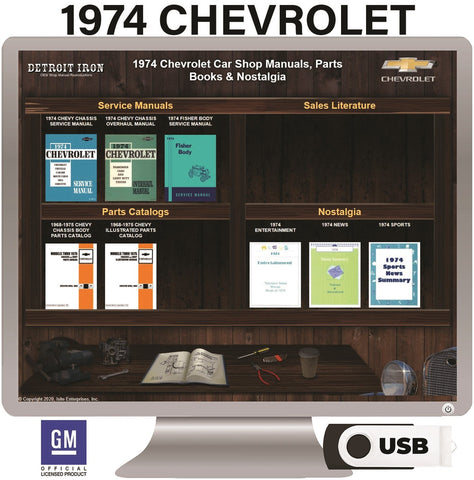 The 1974 Chevrolet Shop Manuals & Parts Books on USB is a digital product published by Detroit Iron and licensed by GM. This Detroit Iron digital product provides a full set of original equipment manufacturer (OEM) repair and rebuild literature in digital / PDF format. This set of manuals and literature were originally authored and published by the car / truck manufacturer to be used by their dealership mechanics so they are very comprehensive. It features an easy-to-use bookcase in a garage scene containing a set of PDF manuals, catalogs, brochures and nostalgia for a specific year, make and model range.