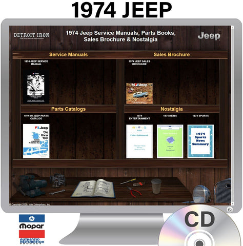 The 1974 Jeep Shop Manual, Parts Book & Sales Brochure on CD is a digital product published by Detroit Iron and licensed by Chrysler. This Detroit Iron digital product provides a full set of original equipment manufacturer (OEM) repair and rebuild literature in digital / PDF format. This set of manuals and literature were originally authored and published by the car / truck manufacturer to be used by their dealership mechanics so they are very comprehensive. It features an easy-to-use bookcase in a garage scene containing a set of PDF manuals, catalogs, brochures and nostalgia for a specific year, make and model range.