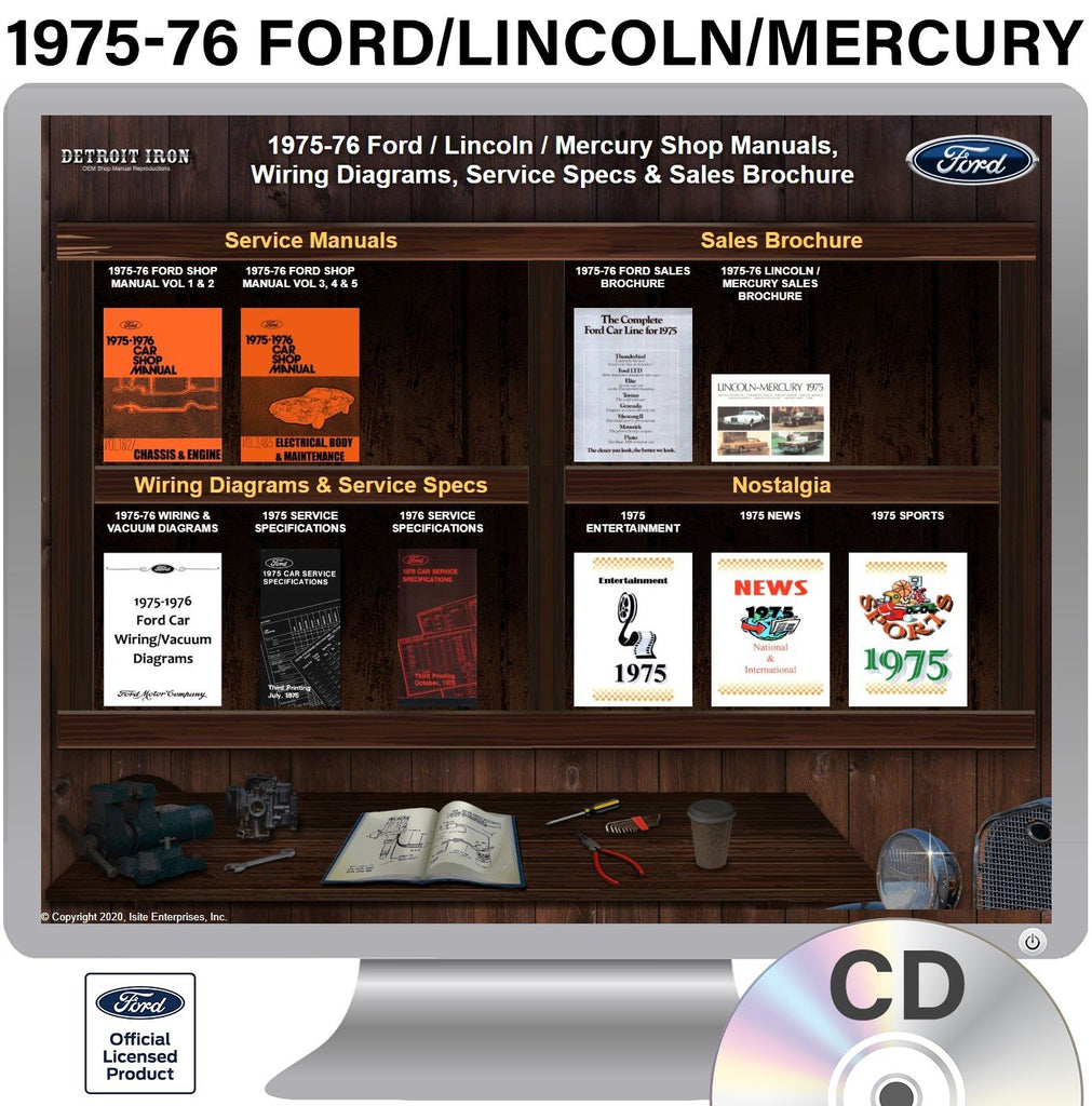 The 1975-1976 Ford Lincoln Mercury Shop Manuals, Sales Literature & Wiring Diagrams / Specs on CD is a digital product published by Detroit Iron and licensed by Ford. This Detroit Iron digital product provides a full set of original equipment manufacturer (OEM) repair and rebuild literature in digital / PDF format. This set of manuals and literature were originally authored and published by the car / truck manufacturer to be used by their dealership mechanics so they are very comprehensive. It features an easy-to-use bookcase in a garage scene containing a set of PDF manuals, catalogs, brochures and nostalgia for a specific year, make and model range.