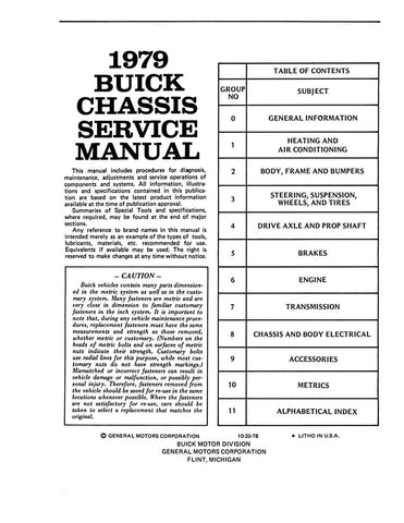 This 1979 Buick Chassis Service Manual All Series - Includes 11x26 COLOR Wiring Diagrams is a high-quality, licensed PRINT reproduction of the service manual authored by Buick Motors Division and published by Detroit Iron. This new print manual is reproduced using the highest quality digital print equipment available - shrink wrapped and ready to be shipped to your location. This OEM factory manual is 8.5 x 11 inches, paperback bound, shrink-wrapped and contains 1750 pages of comprehensive mechanical instructions with detailed diagrams, photos, and specifications for the mechanical components of your vehicle such as the engine, transmission, suspension, brakes, fuel, exhaust, steering, electrical, and drive line. Service/repair manuals were originally written by the automotive manufacturer to be used by their dealership mechanics.