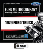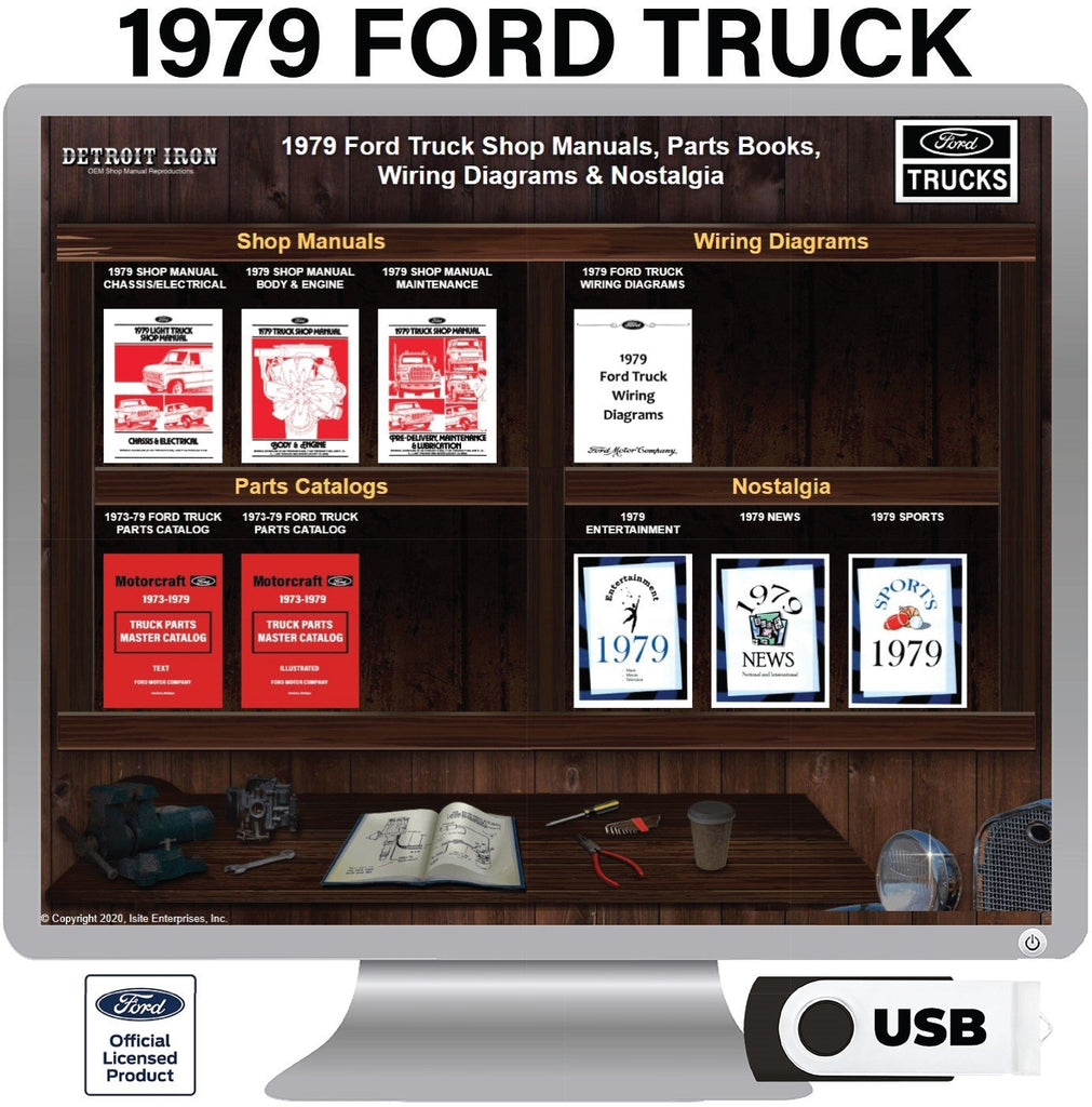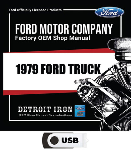 The 1979 Ford Truck Shop Manuals, Parts Books & Wiring Diagrams on USB is a digital product published by Detroit Iron and licensed by Ford. This Detroit Iron digital product provides a full set of original equipment manufacturer (OEM) repair and rebuild literature in digital / PDF format. This set of manuals and literature were originally authored and published by the car / truck manufacturer to be used by their dealership mechanics so they are very comprehensive. It features an easy-to-use bookcase in a garage scene containing a set of PDF manuals, catalogs, brochures and nostalgia for a specific year, make and model range.