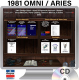 The 1981 Dodge Omni, Aries / Plymouth Horizon, Reliant Shop Manuals, Parts Book, Owner Manuals, & Sales Data on CD is a digital product published by Detroit Iron and licensed by Chrysler. This Detroit Iron digital product provides a full set of original equipment manufacturer (OEM) repair and rebuild literature in digital / PDF format. This set of manuals and literature were originally authored and published by the car / truck manufacturer to be used by their dealership mechanics so they are very comprehensive. It features an easy-to-use bookcase in a garage scene containing a set of PDF manuals, catalogs, brochures and nostalgia for a specific year, make and model range.