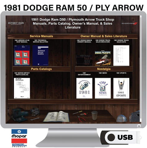 The 1981 Dodge Truck Ram 50 / Plymouth Arrow Shop Manuals, Owner Manual, Parts Book & Sales Literature on USB is a digital product published by Detroit Iron and licensed by Chrysler. This Detroit Iron digital product provides a full set of original equipment manufacturer (OEM) repair and rebuild literature in digital / PDF format. This set of manuals and literature were originally authored and published by the car / truck manufacturer to be used by their dealership mechanics so they are very comprehensive. It features an easy-to-use bookcase in a garage scene containing a set of PDF manuals, catalogs, brochures and nostalgia for a specific year, make and model range.