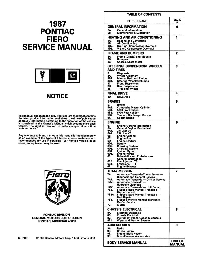 - 1987 Pontiac MODELS COVERED: Fiero