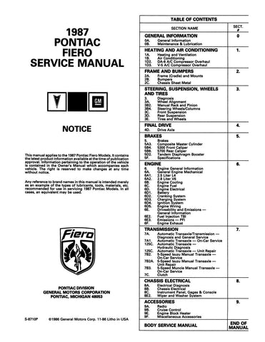 With the 1987 Pontiac Fiero Service Manual in your toolbox, you have the most comprehensive literature at your fingertips to take on the most challenging repair, service and restoration projects. This factory written Detroit Iron shop manual is perfect for the restorer or anyone working on one of these vehicles.