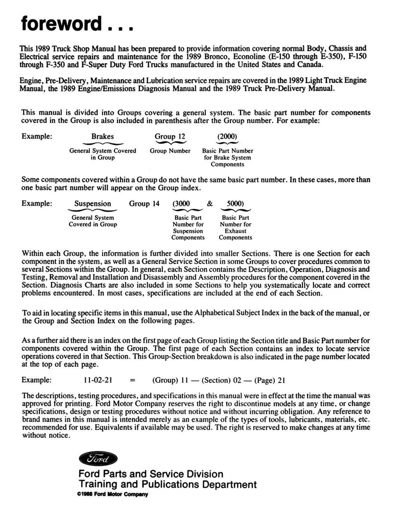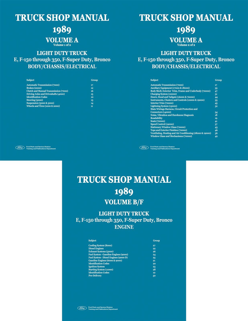 - 1989 Ford MODELS COVERED: Bronco, E-150 Econoline, E-150 Econoline Club Wagon, E-250 Econoline, E-250 Econoline Club Wagon, E-350 Econoline, E-350 Econoline Club Wagon, F-150, F-250, F-350, F Super Duty