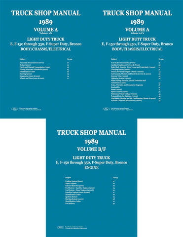 This 1989 Ford F-150-350 Truck, Bronco, E-150-350 Vans, & F-Super Duty Shop Manual Set - Volumes A, B, & F is a high-quality, licensed PRINT reproduction of the service manual authored by Ford Motor Company and published by Detroit Iron. This new print manual is reproduced using the highest quality digital print equipment available - shrink-wrapped and ready to be shipped to your location. This OEM factory manual is 11 x 8.5 inches, paperback bound, shrink-wrapped and contains 2810 pages of comprehensive mechanical instructions with detailed diagrams, photos and specifications for the mechanical components of your vehicle such as the engine, transmission, suspension, brakes, fuel, exhaust, steering, electrical and drive line. Service / repair manuals were originally written by the automotive manufacturer to be used by their dealership mechanics.