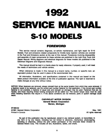 1992 Chevrolet S-10 Models Truck Service Manual