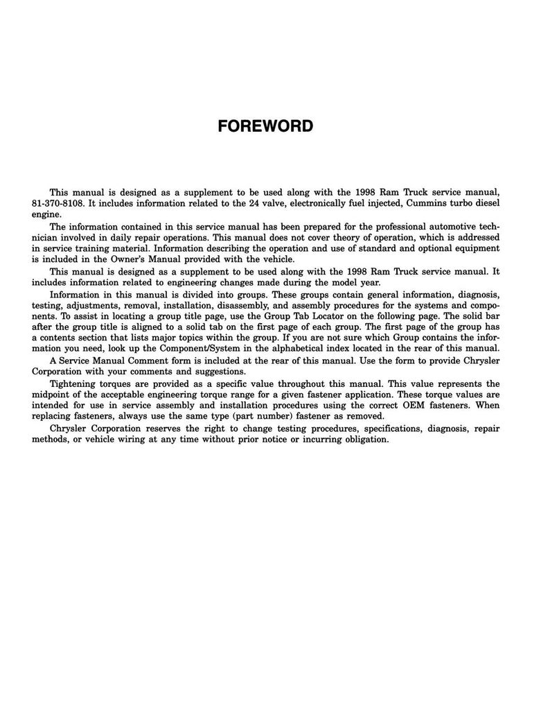 With the 1998 Dodge Ram Truck Diesel Engine Repair Manual Supplement in your toolbox, you have the most comprehensive literature at your fingertips to take on the most challenging repair, service and restoration projects. This factory-written Detroit Iron shop manual is perfect for the restorer or anyone working on one of these vehicles.